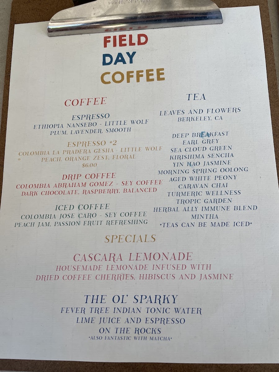 Field Day Coffee offers an impressive selection of meticulously crafted beverages, featuring everything from the rich and flavorful pour-overs to their standout offerings like the Hojicha Latte and seasonal Garden Party. Tea enthusiasts can also indulge in a variety of unique options, such as Ambrosia Black and Honey Orchid Oolong.